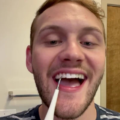 3. Passez à l'action, avec précision et légèreté : Positionnez la pointe sur les zones à traiter : derrière les incisives inférieures, autour des molaires ou le long des gencives. Glissez délicatement sans appuyer, en insistant sur les zones rugueuses ou tachées.